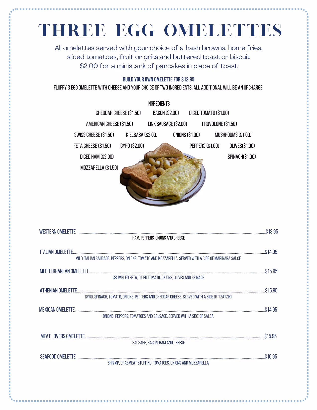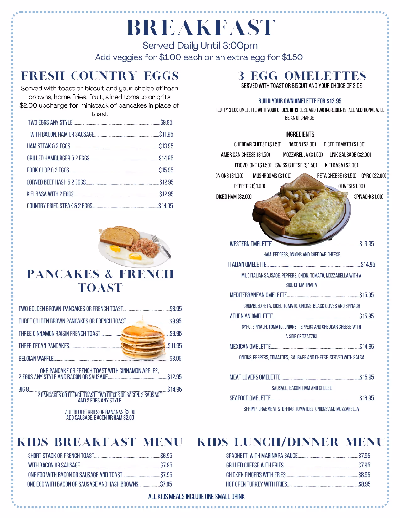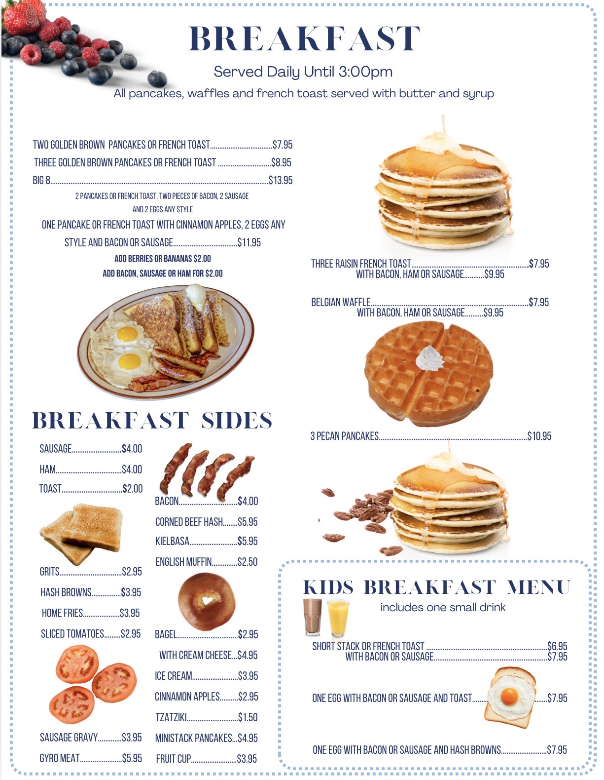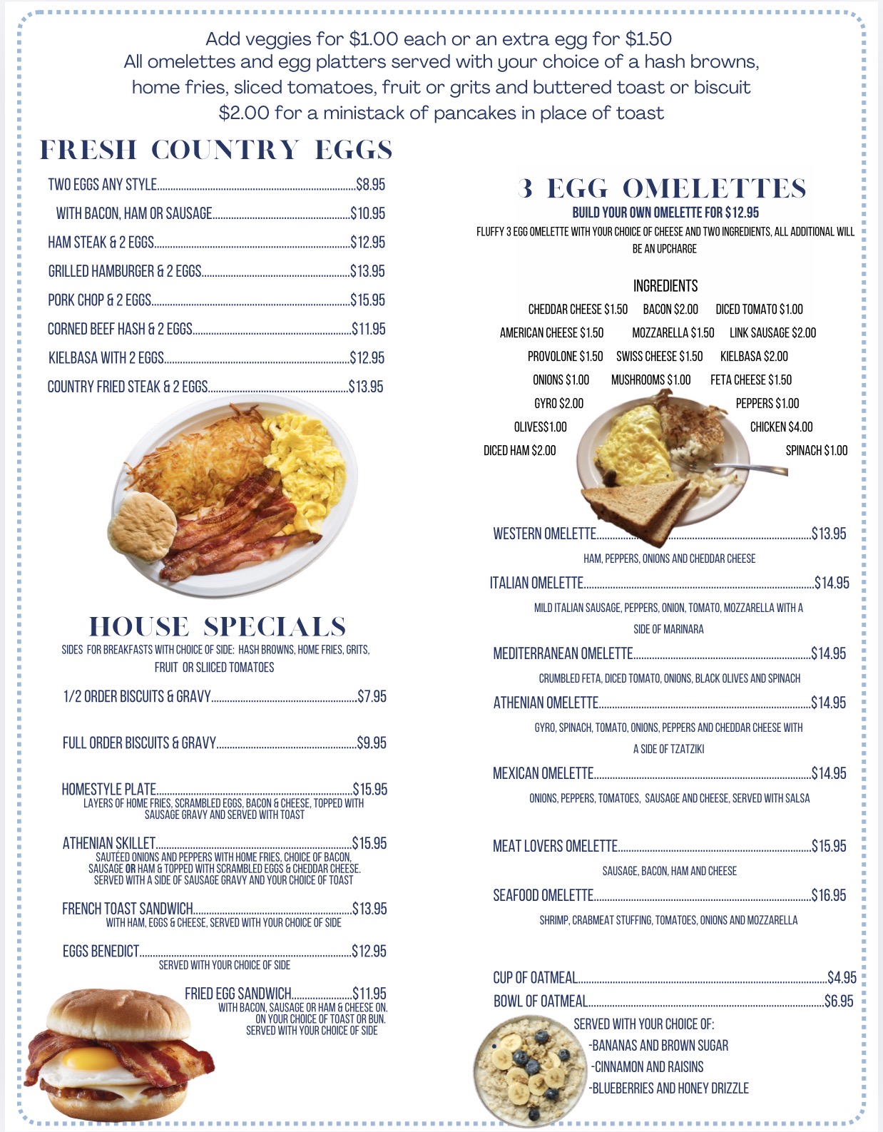 Our family-owned diner has been proudly serving Lee County since 1990! Founded by Christos, our diner has stayed true to its roots with a classic diner-style menu that offers generous portions and a warm, welcoming atmosphere. We serve breakfast until 3pm and begin lunch and dinner at 11am, making it easy to enjoy a delicious meal at any time of day.