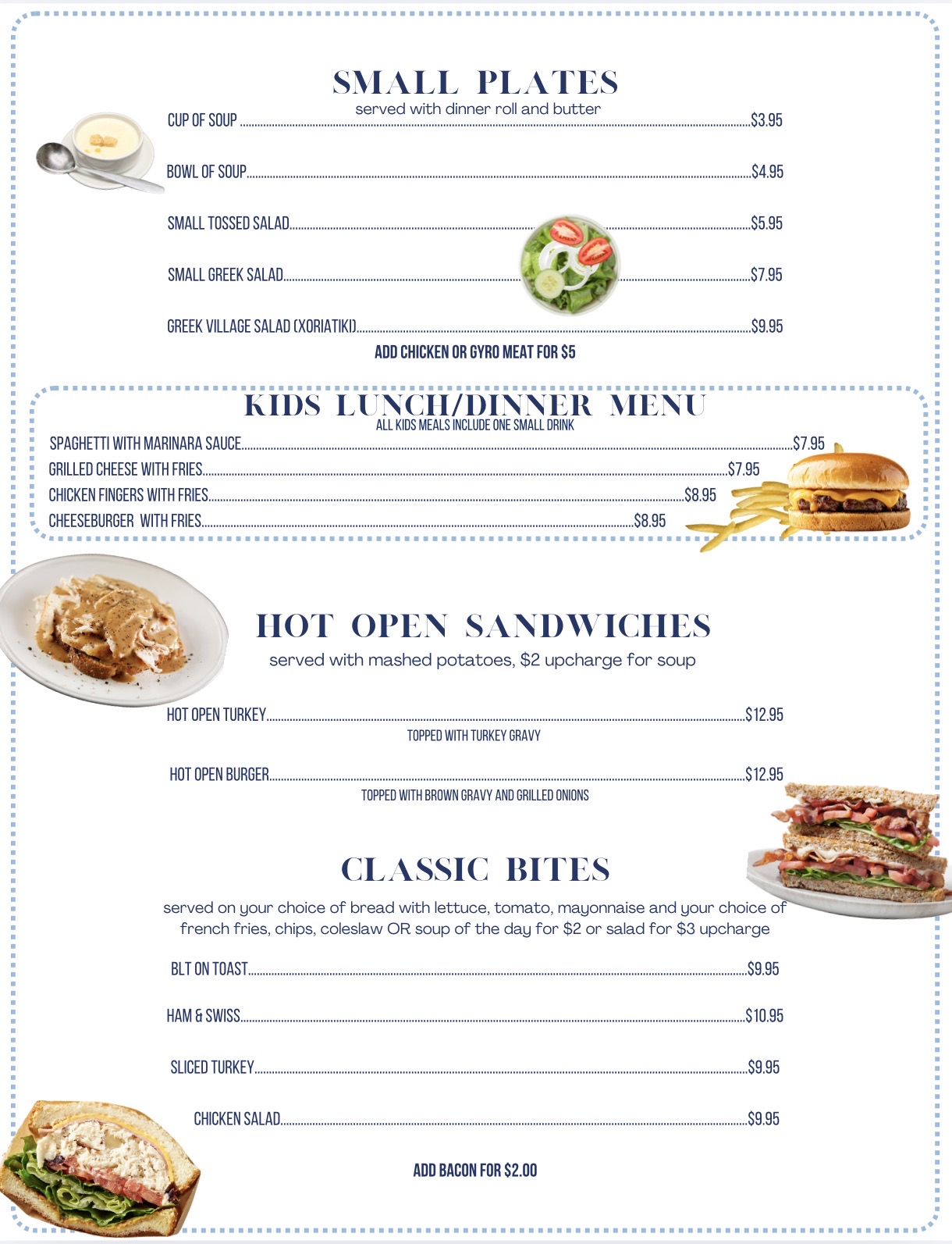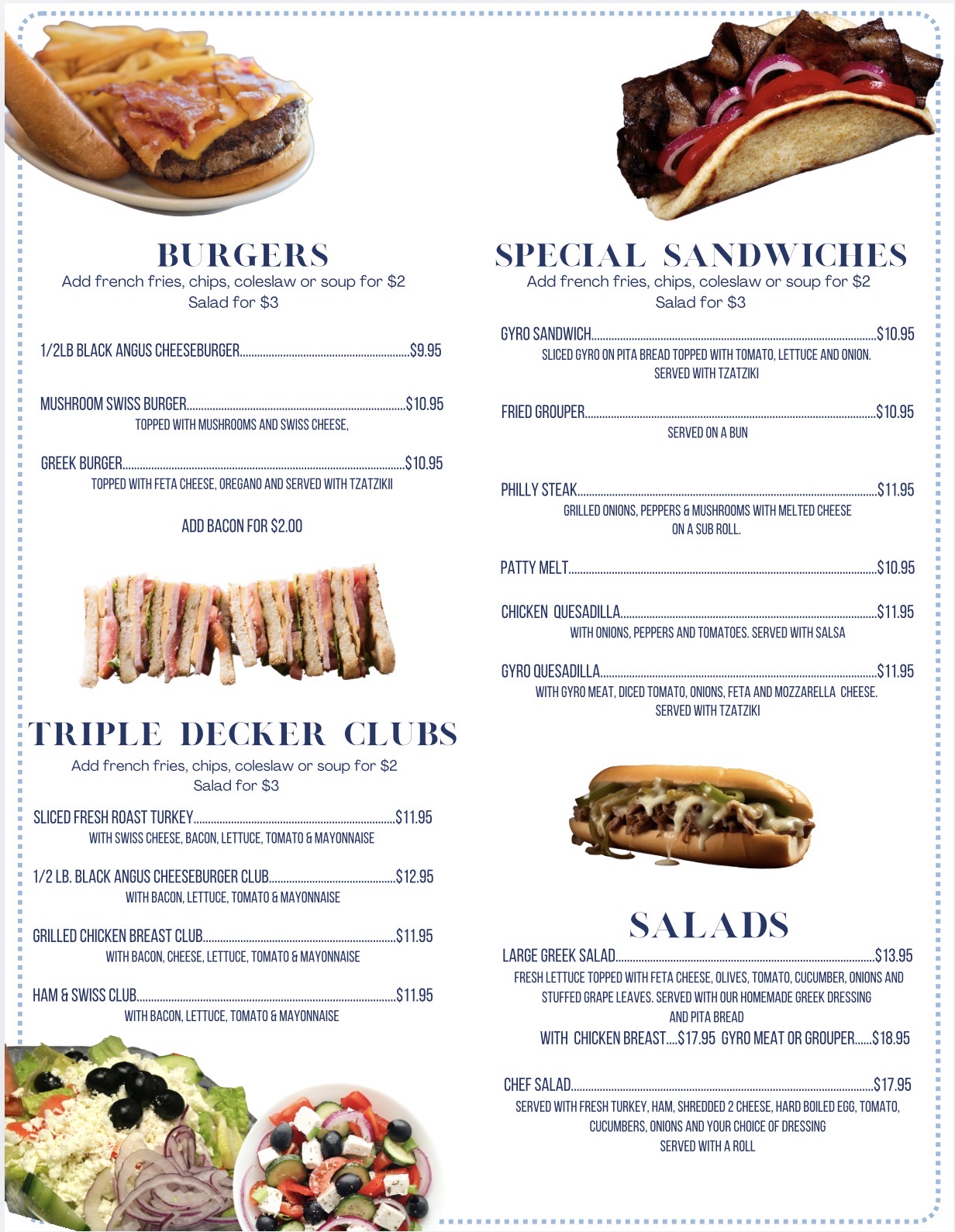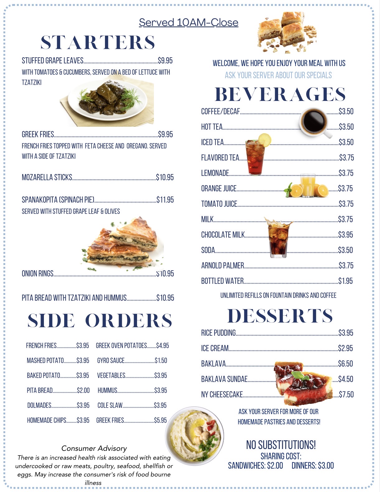 Our menu features a delightful mix of American, Greek, and Italian dishes, all made with the love and care of homestyle cooking. From mouthwatering gyros to indulgent Greek desserts, cheesecakes, and pastries, there's something for everyone here.